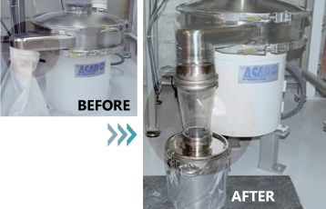しかし、製造工程にある振動ふるい機の接続部からは、微細な粉末が漏れており、工場内は常に粉塵が舞っていました。